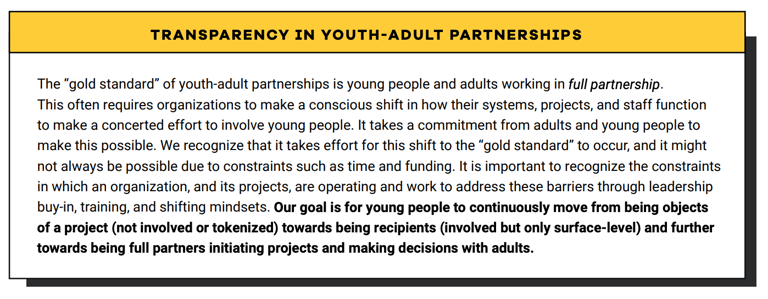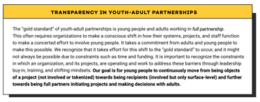 Lastly, youth-adult partnerships require a lot of focus, consistency, energy, and advocacy for youth leadership. This is the difference between tokenizing youth and genuinely engaging with them with respect. Their leadership must be centered in order for success to be sustained at the organization in a genuine way.