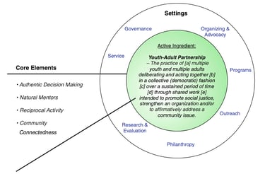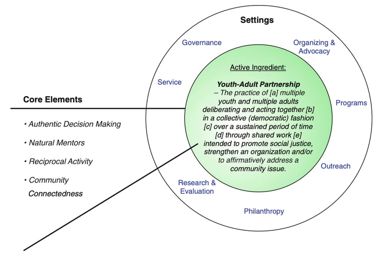 Youth-adult partnerships center youth as experts of their own reality, utilizing their experience and voice to help create programing, decide what relevant direction an organization should move towards, and offer insight in the effectiveness of organizational work, especially if the youth is also a participant in the organization. The following image from the above-mentioned article by Zeldin, Christens, and Powers lists the settings in which these partnerships can be formed and maintained: