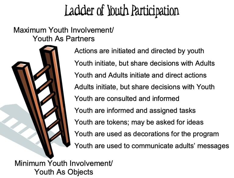 The image below is the "Ladder of Youth Participation" from the Texas Network of Youth Services' Making It Work A Guide to Successful Youth-Adult Partnerships. It helps gauge meaningful youth participation in an organization. The top of the ladder is where true engagement and power sharing with youth should be for a positive youth adult partnership, while the bottom of the ladder sheds light on relationships that do not genuinely give youth the opportunity to lead. Where does your organization fall on the ladder, and how can you climb it in partnership with youth to ensure shared success?
