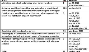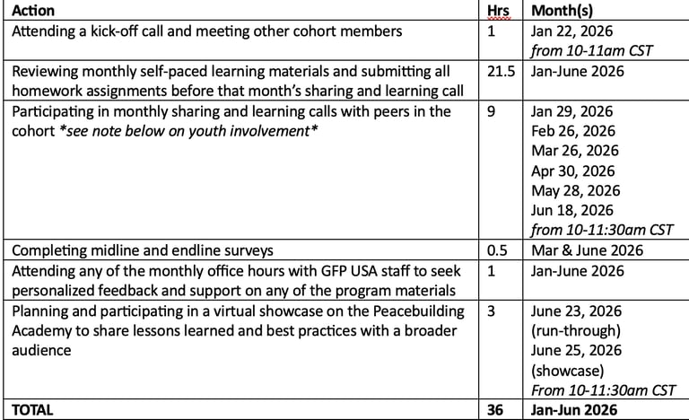 The 2026 Peacebuilding Academy will include self-paced training modules, practical assignments to apply new learnings, monthly sharing and learning calls with others in the cohort, and office hours for personalized mentoring and technical assistance. Participating organizations can expect to spend about 6 hours per month on the Peacebuilding Academy, for a total commitment of approximately 36 hours. We will organize a final virtual showcase at the end for participating organizations to reflect on and celebrate their lessons learned and best practices with a broader audience.